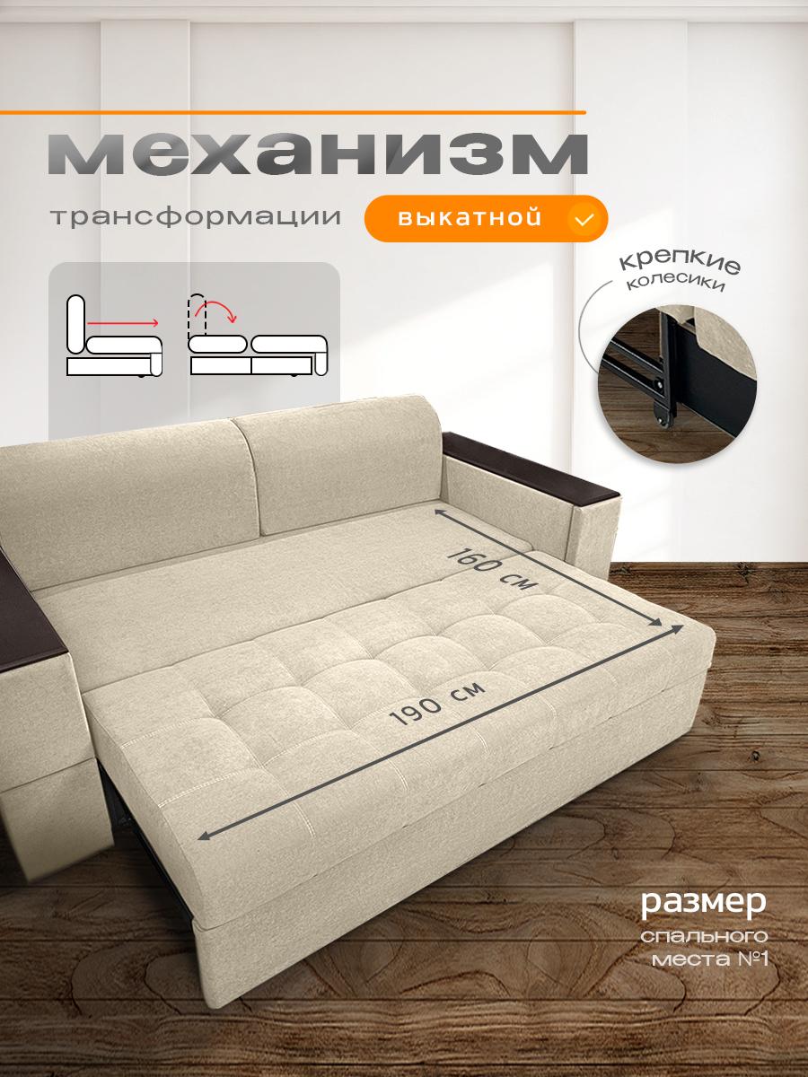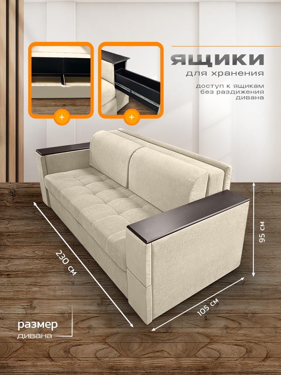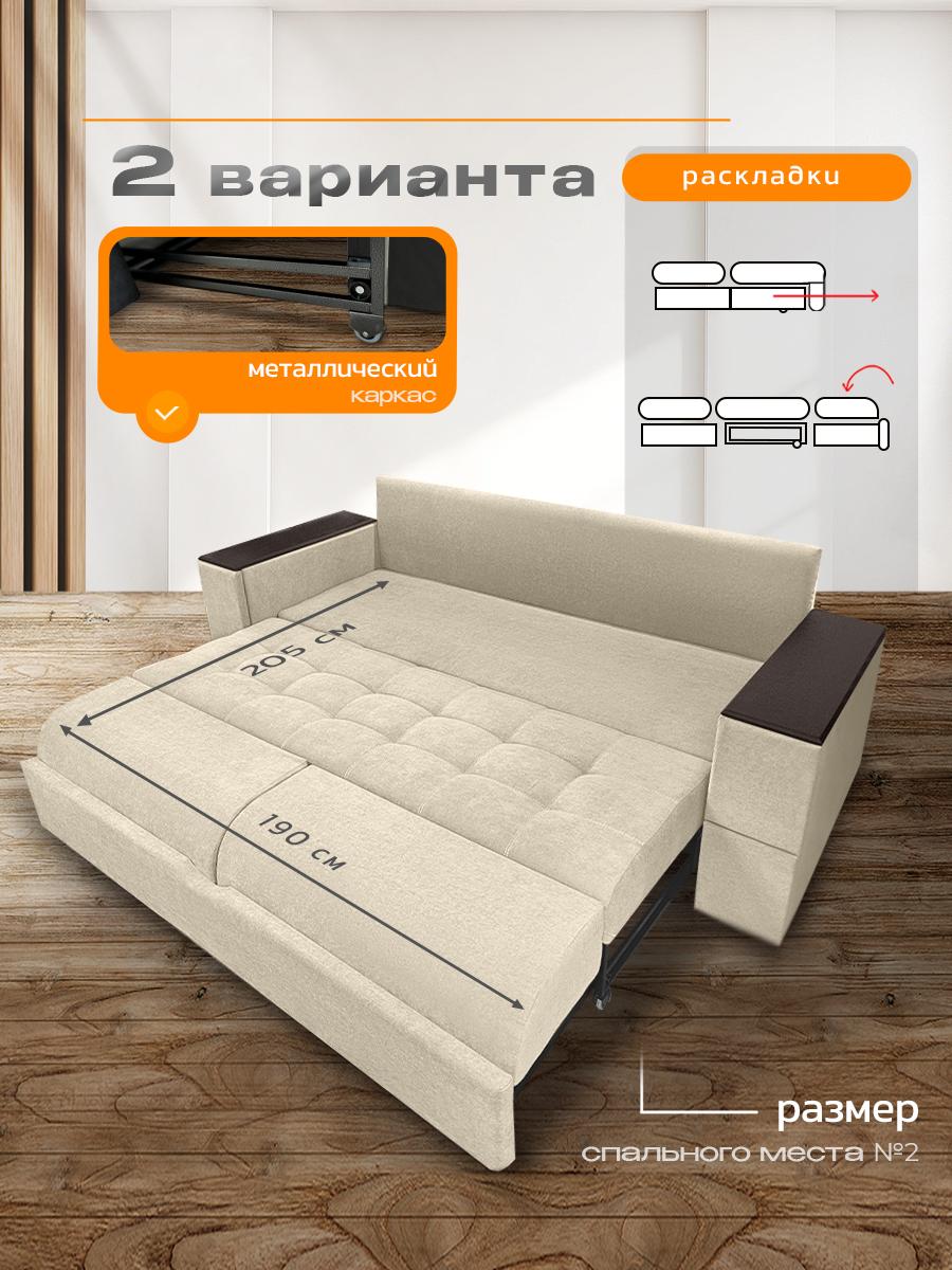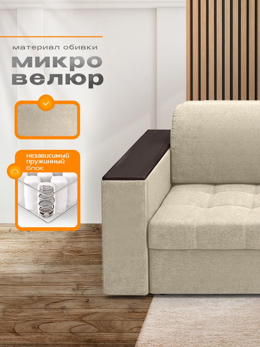Диван кровать раскладной Айсберг с столом и ящиком на металлокаркасе, Ищете раскладной диван с продуманными деталями, вместительным хранением и ортопедическими свойствами? Диван «Айсберг» сочетает всё это и даже больше: прочный металлокаркас, мягкая обивка из микровелюра, независимый пружинный блок и уникальные функции для вашего удобства. Идеальный выбор для гостиной, спальни или студии. Почему стоит выбрать диван «Айсберг»? Два варианта раскладывания — адаптируйте диван под свои потребности: компактный вариант: 160 × 190 см; просторный вариант: 190 × 205 см. Прочный металлокаркас — гарантирует устойчивость и долговечность даже при ежедневном использовании. Выдерживает высокие нагрузки без деформаций. Ортопедическое наполнение — независимый пружинный блок средней жёсткости поддерживает позвоночник в анатомически правильном положении. Каждая пружина работает автономно: это исключает эффект «гамака» и равномерно распределяет нагрузку. Многофункциональные подлокотники — в них встроены: выдвижной стол: создайте компактную рабочую зону для ноутбука, завтрака или творчества; ящик для хранения: храните мелочи, книги, пульты или аксессуары. Стильный дизайн с деталями — декоративные деревянные накладки на подлокотниках добавляют модели изысканности и создают приятный контраст с обивкой из микровелюра. Мягкая и практичная обивка — микровелюр приятен на ощупь, устойчив к истиранию, не выцветает на солнце и легко чистится. Подходит для семей с детьми и домашними животными. Комфортные параметры посадки: высота посадки: 44 см — удобно вставать и садиться; глубина посадки: 80 см без подушек, около 60 см с подушками — достаточно места для расслабленного отдыха. Оптимальные габариты (230 × 105 × 105 см) — диван гармонично впишется в интерьер, не занимая много места. Ключевые характеристики: Модель: диван «Айсберг». Габариты (Д × Ш × В): 230 × 105 × 105 см. Спальное место: два варианта (160 × 190 см или 190 × 205 см).