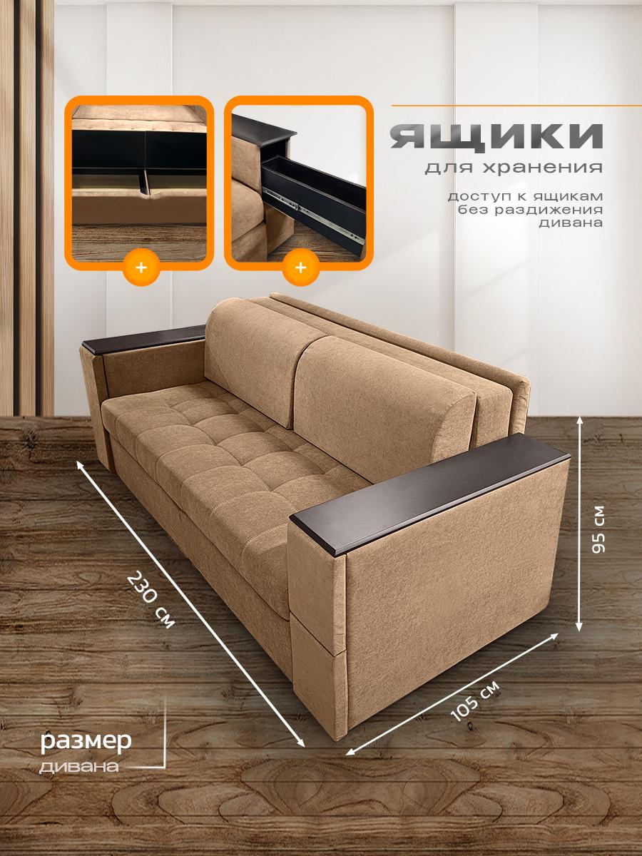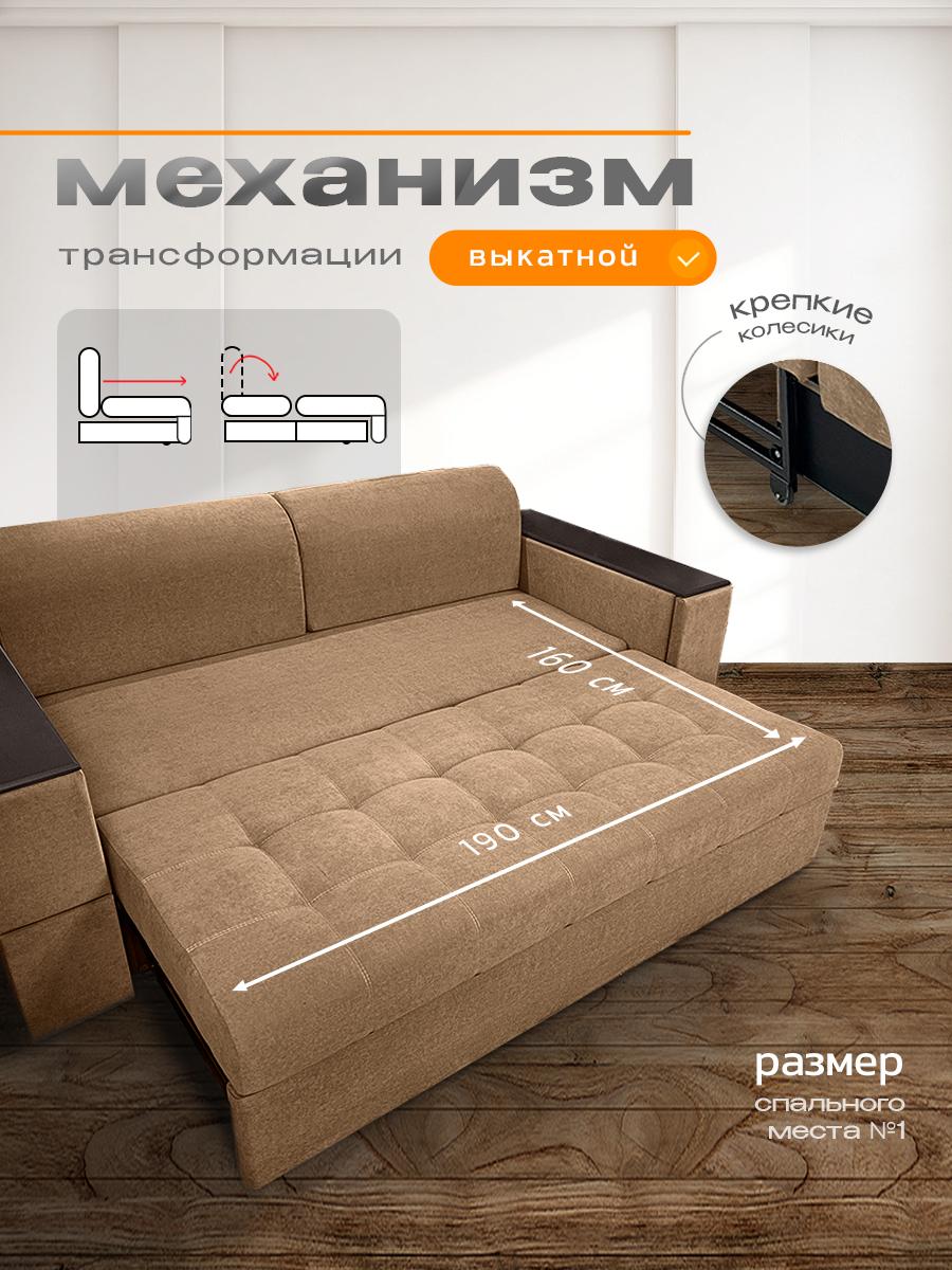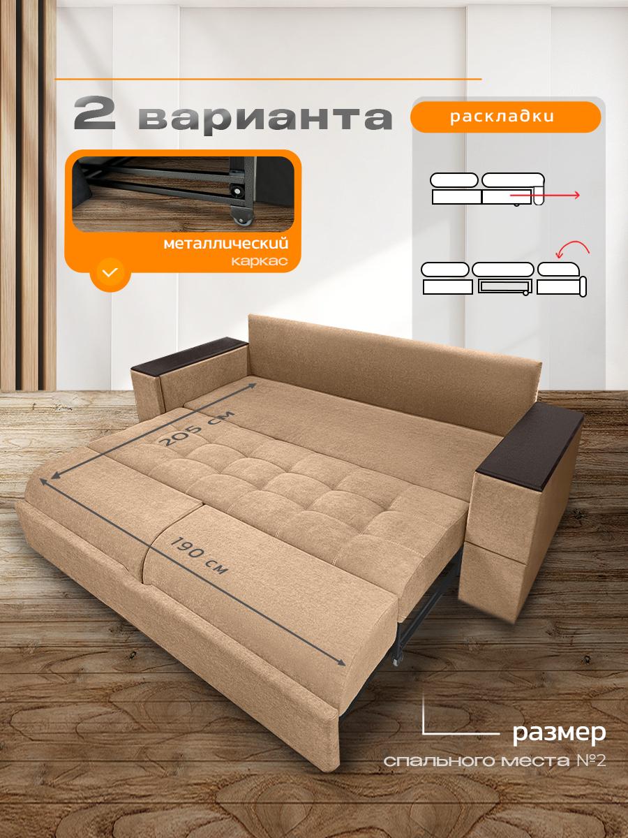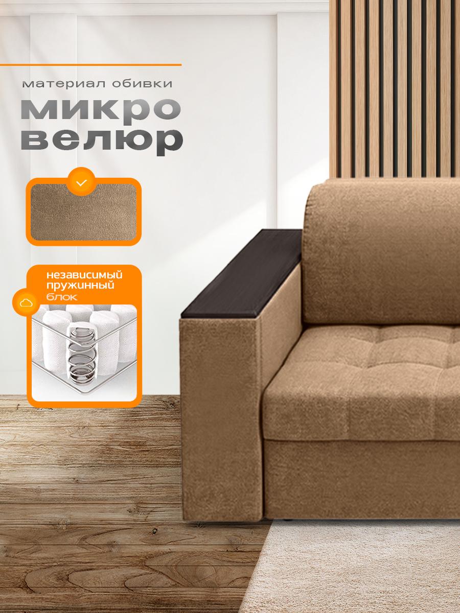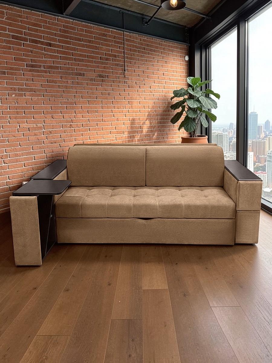 Диван кровать раскладной Айсберг с столом и ящиком на металлокаркасе, Ищете раскладной диван с продуманными деталями, вместительным хранением и ортопедическими свойствами? Диван «Айсберг» сочетает всё это и даже больше: прочный металлокаркас, мягкая обивка из микровелюра, независимый пружинный блок и уникальные функции для вашего удобства. Идеальный выбор для гостиной, спальни или студии. Почему стоит выбрать диван «Айсберг»? Два варианта раскладывания — адаптируйте диван под свои потребности: компактный вариант: 160 × 190 см; просторный вариант: 190 × 205 см. Прочный металлокаркас — гарантирует устойчивость и долговечность даже при ежедневном использовании. Выдерживает высокие нагрузки без деформаций. Ортопедическое наполнение — независимый пружинный блок средней жёсткости поддерживает позвоночник в анатомически правильном положении. Каждая пружина работает автономно: это исключает эффект «гамака» и равномерно распределяет нагрузку. Многофункциональные подлокотники — в них встроены: выдвижной стол: создайте компактную рабочую зону для ноутбука, завтрака или творчества; ящик для хранения: храните мелочи, книги, пульты или аксессуары. Стильный дизайн с деталями — декоративные деревянные накладки на подлокотниках добавляют модели изысканности и создают приятный контраст с обивкой из микровелюра. Мягкая и практичная обивка — микровелюр приятен на ощупь, устойчив к истиранию, не выцветает на солнце и легко чистится. Подходит для семей с детьми и домашними животными. Комфортные параметры посадки: высота посадки: 44 см — удобно вставать и садиться; глубина посадки: 80 см без подушек, около 60 см с подушками — достаточно места для расслабленного отдыха. Оптимальные габариты (230 × 105 × 105 см) — диван гармонично впишется в интерьер, не занимая много места. Ключевые характеристики: Модель: диван «Айсберг». Габариты (Д × Ш × В): 230 × 105 × 105 см. Спальное место: два варианта (160 × 190 см или 190 × 205 см).