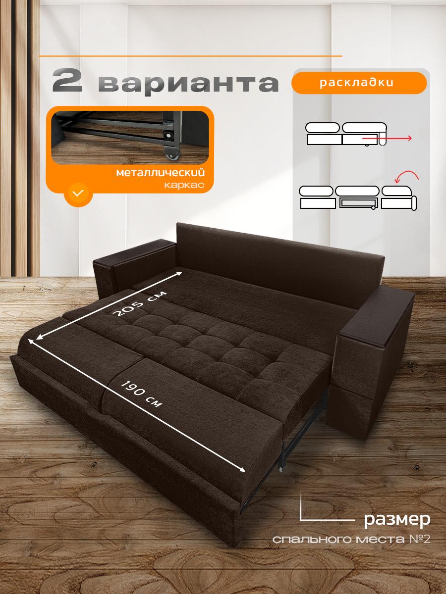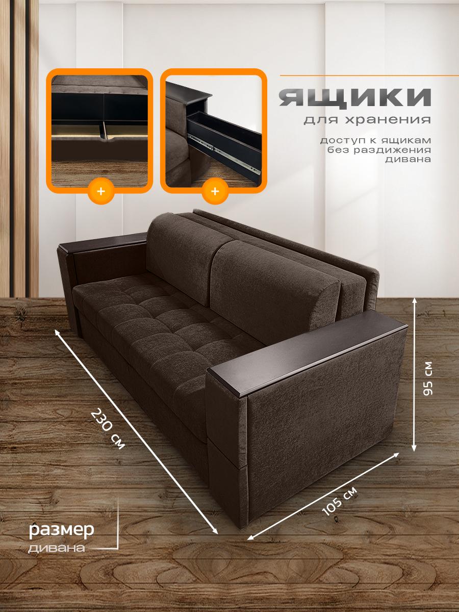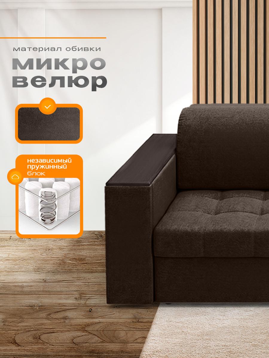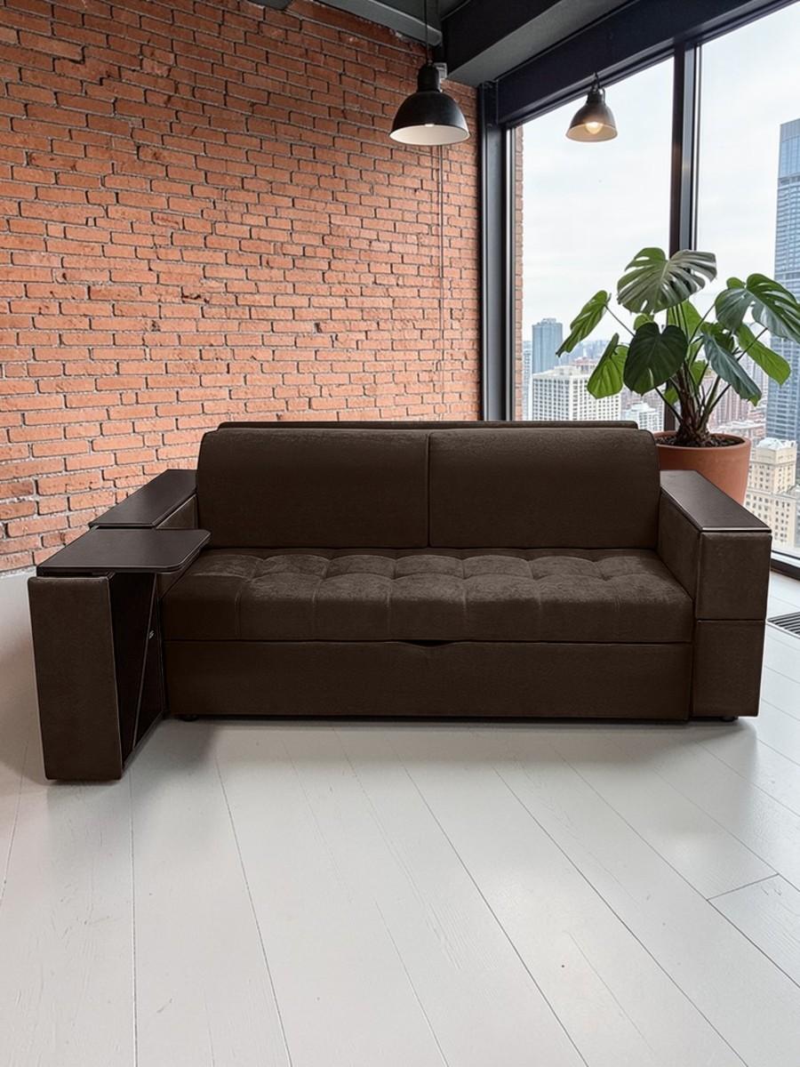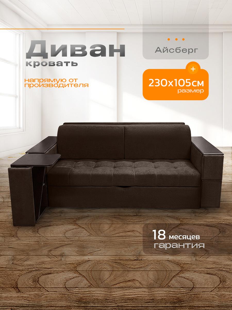 Диван кровать раскладной Айсберг с столом и ящиком на металлокаркасе, Ищете раскладной диван с продуманными деталями, вместительным хранением и ортопедическими свойствами? Диван «Айсберг» сочетает всё это и даже больше: прочный металлокаркас, мягкая обивка из микровелюра, независимый пружинный блок и уникальные функции для вашего удобства. Идеальный выбор для гостиной, спальни или студии. Почему стоит выбрать диван «Айсберг»? Два варианта раскладывания — адаптируйте диван под свои потребности: компактный вариант: 160 × 190 см; просторный вариант: 190 × 205 см. Прочный металлокаркас — гарантирует устойчивость и долговечность даже при ежедневном использовании. Выдерживает высокие нагрузки без деформаций. Ортопедическое наполнение — независимый пружинный блок средней жёсткости поддерживает позвоночник в анатомически правильном положении. Каждая пружина работает автономно: это исключает эффект «гамака» и равномерно распределяет нагрузку. Многофункциональные подлокотники — в них встроены: выдвижной стол: создайте компактную рабочую зону для ноутбука, завтрака или творчества; ящик для хранения: храните мелочи, книги, пульты или аксессуары. Стильный дизайн с деталями — декоративные деревянные накладки на подлокотниках добавляют модели изысканности и создают приятный контраст с обивкой из микровелюра. Мягкая и практичная обивка — микровелюр приятен на ощупь, устойчив к истиранию, не выцветает на солнце и легко чистится. Подходит для семей с детьми и домашними животными. Комфортные параметры посадки: высота посадки: 44 см — удобно вставать и садиться; глубина посадки: 80 см без подушек, около 60 см с подушками — достаточно места для расслабленного отдыха. Оптимальные габариты (230 × 105 × 105 см) — диван гармонично впишется в интерьер, не занимая много места. Ключевые характеристики: Модель: диван «Айсберг». Габариты (Д × Ш × В): 230 × 105 × 105 см. Спальное место: два варианта (160 × 190 см или 190 × 205 см).