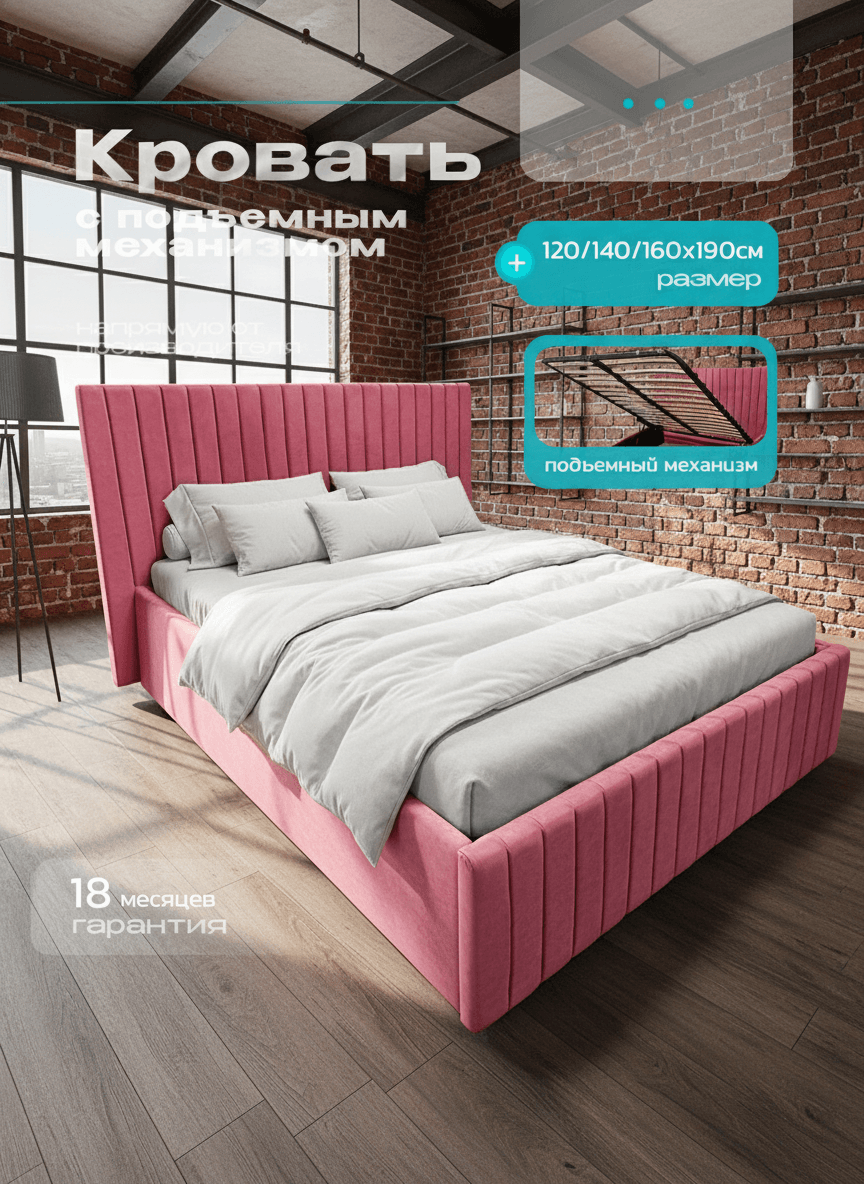 Кровать «Ларсен» — современный комфорт и функциональность в каждой детали Создайте уютную и стильную спальню с кроватью «Ларсен». Модель в современном дизайне сочетает элегантность, практичность и продуманную эргономику. Высокое мягкое изголовье станет вашим любимым местом для вечернего чтения, а подъёмный механизм обеспечит удобный доступ к вместительному ящику для белья. Почему стоит выбрать кровать «Ларсен»: Современный дизайн. Лаконичные линии и обивка из микровелюра гармонично впишутся в любой интерьер — от минимализма до скандинавского стиля. Высокое мягкое изголовье. Обеспечивает максимальный комфорт во время отдыха и придаёт модели выразительный внешний вид. Практичный подъёмный механизм. Позволяет легко получить доступ к пространству для хранения. Вместительный ящик идеально подходит для сезонного постельного белья, одеял и подушек. Прочная конструкция. Каркас из ДСП и фанеры дополнен надёжными ламелями, которые обеспечивают оптимальную поддержку матраса и продлевают срок службы изделия. Экономия пространства. Ящик для хранения заменяет дополнительные комоды и шкафы, что особенно актуально для небольших комнат. Основные характеристики: Размеры кровати: 188×202×126 см (Ш × Г × В). Спальное место: 160×190 см. Материал каркаса: ДСП, фанера. Обивка: микровелюр — приятный на ощупь, износостойкий и лёгкий в уходе материал. Высота нижней базы: 43 см. Утопание матраса: 6 см. Максимальная высота матраса: 22 см. Зазор от пола до кровати: 2 см. Максимальная нагрузка на ящик для белья: 10–15 кг (не предназначен для тяжёлых предметов). Матрас: не входит в комплект (вы можете подобрать модель с учётом ваших предпочтений по жёсткости и высоте). Идеальный выбор для тех, кто ценит: современный дизайн; функциональность и организацию пространства; комфорт во время сна и отдыха; надёжность и долговечность мебели. Добавьте кровать «Ларсен» в корзину прямо сейчас и создайте спальню своей мечты!